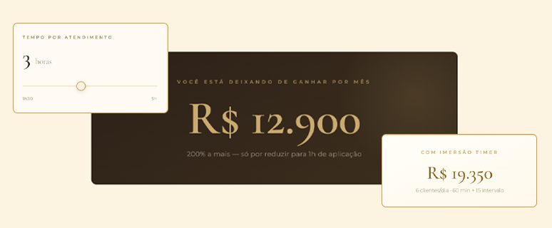 Você investe R$ 297. Aplica o método Imersão Timer. Dedica 15 minutos por dia de treino. Cronometra tudo. Em 21 dias, você reduz de 3h30 para 1h30. Atende 6 clientes por dia ao invés de 3. Fatura 4x mais. Tem orgulho do que conquistou.